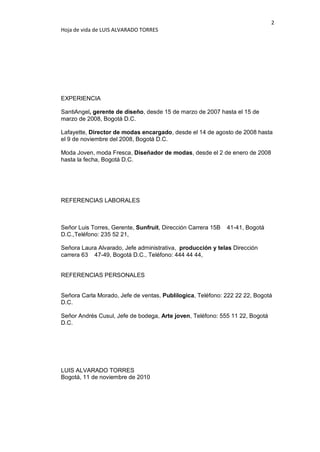 El documento presenta la hoja de vida de Luis Alvarado Torres, incluyendo sus datos personales, estudios, experiencia laboral y referencias. Luis Alvarado Torres nació en 1994 en Bogotá, es casado y ha estudiado diseño de moda. Cuenta con experiencia como gerente de diseño, director de modas y diseñador independiente.