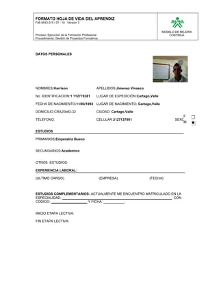 Este documento presenta un formato de hoja de vida para un aprendiz que incluye secciones para datos personales, estudios (primaria, secundaria, otros), experiencia laboral, estudios complementarios actuales, fechas de inicio y fin de la etapa lectiva, duración de la etapa productiva, y referencias personales. El formato está diseñado para recopilar información relevante sobre el aprendiz y su trayectoria educativa y laboral.