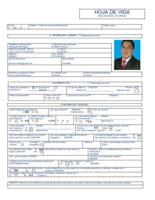 Este documento contiene una hoja de vida de William Alfonso Rodriguez Rodriguez, donde proporciona información personal, familiar, educativa, laboral y de contacto para aplicar a un puesto de trabajo. Entre la información más relevante se encuentra su experiencia de 6 años como técnico electromecánico, sus estudios técnicos en electromecánica en el SENA de Sogamoso, y su aspiración salarial de $800.000.
