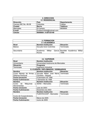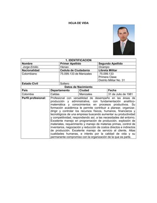 Este hoja de vida resume la información personal, educación y experiencia laboral de Jorge Emilio Henao Ocampo. Detalla su formación académica en ingeniería industrial y cursos técnicos, así como su experiencia como operario, metrólogo, asistente de producción, coordinador de planta e ingeniero de planta para varias empresas. Actualmente se desempeña como docente en la UPB y UCM.
