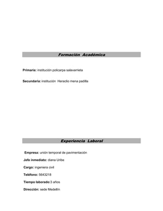 Este documento presenta la información personal, perfil ocupacional, formación académica, experiencia laboral y referencias de John Jairo Mora. Incluye sus datos personales como nombre, cédula, fecha y lugar de nacimiento. Describe su perfil como una persona comprometida, con ideas innovadoras y facilidad para trabajar en equipo. Detalla su educación primaria y secundaria, así como su experiencia de 3 años como ingeniero civil en una empresa de pavimentación en Medellín. Proporciona también los datos de contacto de una referencia laboral.