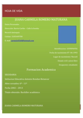 La hoja de vida presenta los datos personales, formación académica y experiencia laboral de Juana Carmela Romero Maturana. Estudió bachillerato en el colegio Antonio Rondan Betancur y actualmente cursa el programa técnico en mantenimiento y cuidado de playas de la Gobernación de Antioquia y Confenalco Antioquia. No tiene experiencia laboral previa y proporciona referencias familiares y personales.