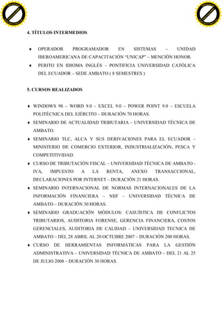 El documento presenta el currículum vitae de María Fernanda Rodríguez Abril. Detalla su información personal y lugar de nacimiento, así como sus estudios realizados que incluyen una licenciatura en Contabilidad y Auditoría. También enumera diversos cursos y capacitaciones que ha tomado en áreas como sistemas, idiomas, tributación, gestión y servicio al cliente.