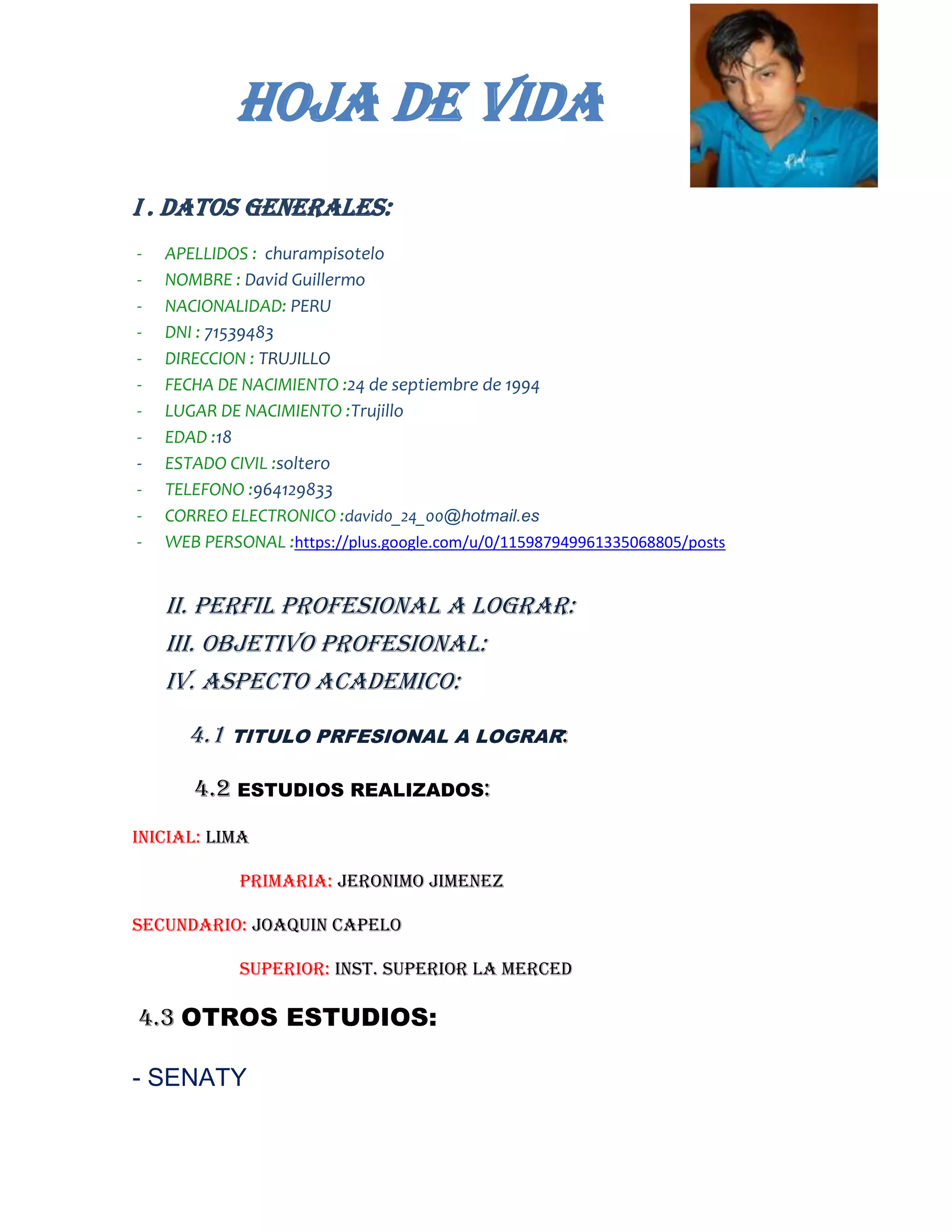 El documento presenta los datos personales de David Guillermo Churampisotelo, incluyendo su nombre, dirección, fecha de nacimiento, educación y experiencia. Estudió primaria en el colegio Jerónimo Jiménez y secundaria en el colegio Joaquín Capelo, y actualmente estudia en el Instituto Superior La Merced.