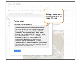 Este documento ofrece una introducción a las hojas de cálculo de Google Docs, explicando sus funcionalidades básicas como crear, editar y compartir hojas de cálculo, agregar fórmulas y gráficos, e importar y exportar datos. También cubre temas como utilizar plantillas, establecer reglas de formato condicional, publicar hojas en línea y trabajar con mapas y gadgets.