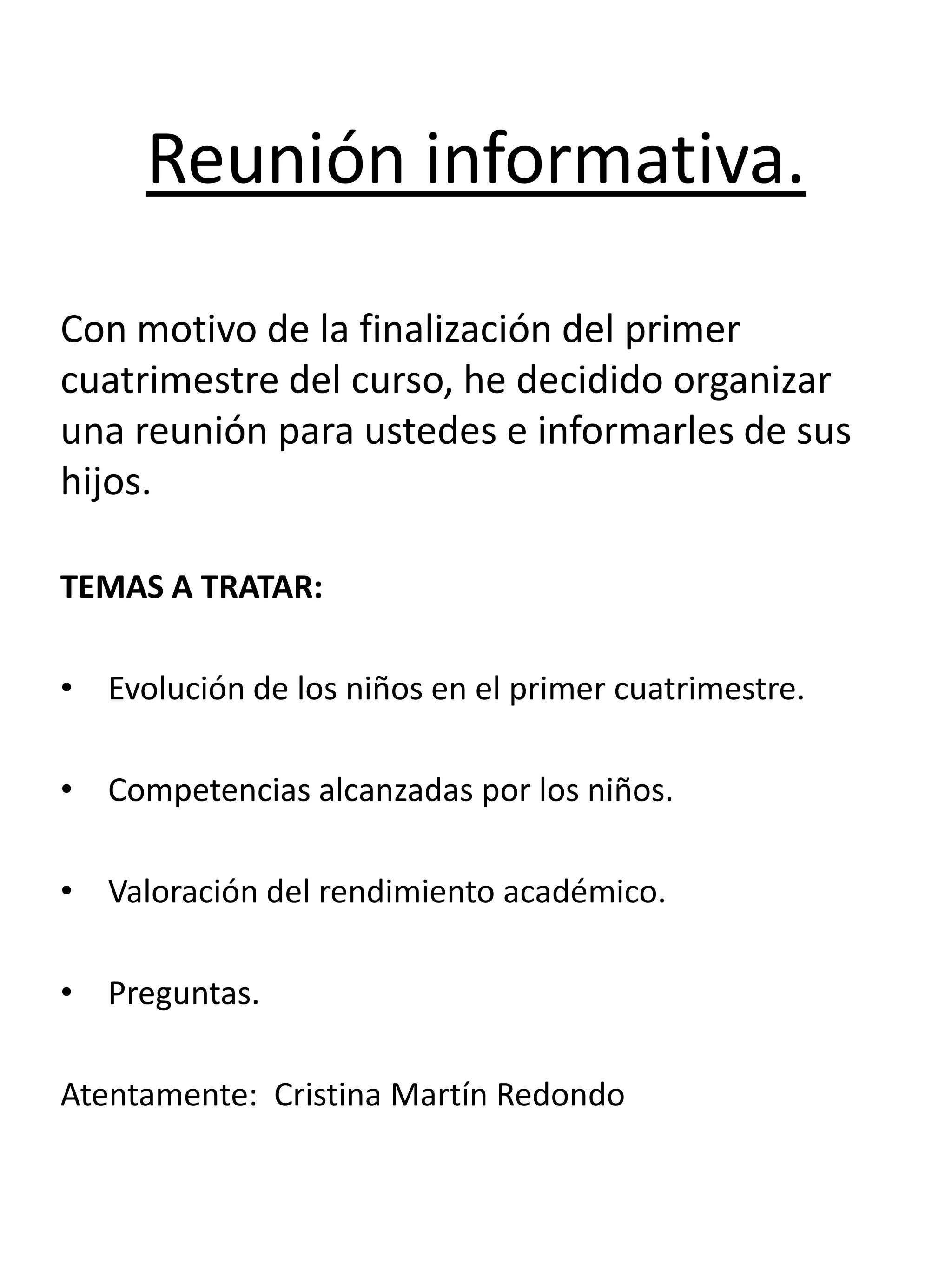 La maestra Cristina Martín Redondo organizará una reunión informativa para los padres sobre el progreso de sus hijos en el primer cuatrimestre, incluyendo la evolución, competencias alcanzadas y rendimiento académico, y responderá cualquier pregunta.