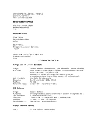 Mario Ortiz Infante es un estudiante de especialización en educación matemática y docente de física. Actualmente está finalizando su trabajo de grado. Tiene experiencia docente en colegios donde ha enseñado física y matemáticas. Se describe a sí mismo como alegre, emprendedor, responsable, con facilidad para el aprendizaje y el trabajo en equipo.