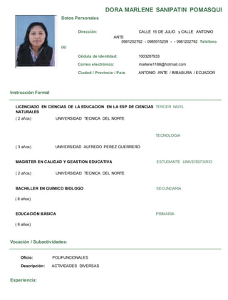 Este documento presenta los datos personales, educación e historia laboral de Dora Marlene Sanipatin Pomasqui. Ella tiene una licenciatura en Ciencias de la Educación y está estudiando una maestría en Calidad y Gestión Educativa. Ha trabajado como docente y directora en varias escuelas desde 2010. También lista capacitaciones y seminarios educativos completados, y proporciona referencias personales.