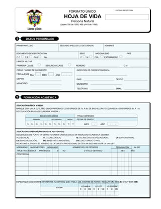 Este documento presenta un formato único de hoja de vida para personas naturales que contiene secciones para incluir datos personales, formación académica, experiencia laboral, tiempo total de experiencia, y observaciones del jefe de recursos humanos. El formato pide información como nombres, documento de identidad, educación, idiomas, cargos y empleadores anteriores, entre otros datos relevantes.