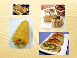 El documento proporciona información sobre el hojaldre y el semihojaldre. Explica que el hojaldre se caracteriza por tener capas formadas por múltiples vueltas y estiramientos de la masa, y que la grasa entre las capas permite que el vapor levante y expanda la masa durante el horneado. También clasifica el hojaldre según su método de elaboración y composición, e incluye fórmulas e instrucciones para la elaboración de productos de hojaldre como cartuchos, corazones y vol-