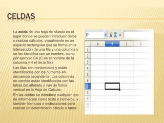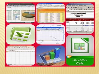 Una hoja de cálculo permite organizar y manipular datos numéricos y alfanuméricos en celdas dispuestas en filas y columnas. Cada celda puede contener valores, fórmulas u otros cálculos. Existen diferentes programas de hojas de cálculo como Excel, Calc, Gnumeric y Numbers que ofrecen funciones para realizar cálculos, gráficos y más.