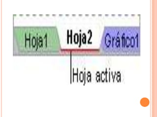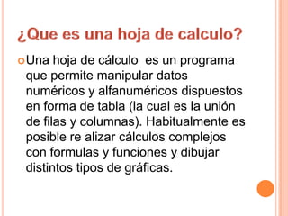 Una hoja de cálculo es un programa que permite organizar y manipular datos numéricos y de texto en celdas dispuestas en filas y columnas. Las principales hojas de cálculo incluyen Excel de Microsoft, Calc de OpenOffice y 1-2-3 de Lotus. Un libro de hoja de cálculo contiene una o más hojas de cálculo y gráficos relacionados que permiten organizar y vincular información.