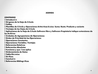 Este documento presenta una agenda sobre las hojas de cálculo. Explica los orígenes de las hojas de cálculo, las celdas, y cómo realizar operaciones aritméticas básicas. También describe las ventajas de las hojas de cálculo, aplicaciones de software libre y propietario, símbolos de agrupación, orden de prioridad de operaciones, referencias relativas y absolutas, funciones, ordenamiento de datos y tablas dinámicas.