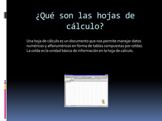 Una hoja de cálculo es un documento que permite organizar y analizar datos numéricos y de texto en celdas. Dan Bricklin inventó la hoja de cálculo electrónica en 1971 para replicar los cálculos de un profesor en una pizarra. Las celdas son los espacios rectangulares donde se introducen datos u operaciones matemáticas mediante fórmulas, y se identifican por filas y columnas. Las hojas de cálculo se usan comúnmente para almacenar datos, realizar cálculos complejos como presupuestos,