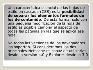 Este documento describe las características principales de las hojas de estilo en cascada (CSS). Explica que CSS permite separar la presentación del contenido y que pequeños cambios en la hoja de estilo pueden modificar el aspecto de todas las páginas. También cubre conceptos como la herencia de estilos, el orden de prioridad de las reglas CSS, y los diferentes métodos para incluir hojas de estilo como incrustación, vinculación e importación.