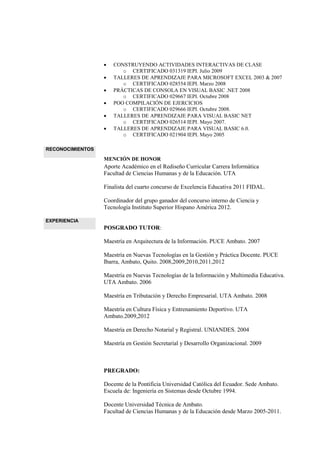 El documento presenta el currículum vitae de Ing. M.Sc Patricio Medina, que incluye sus datos personales, educación, certificaciones, publicaciones, reconocimientos, experiencia laboral docente y en desarrollo de software, proyectos de investigación, organizaciones a las que pertenece y seminarios dictados.