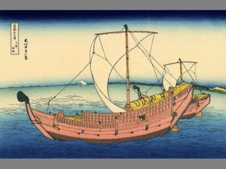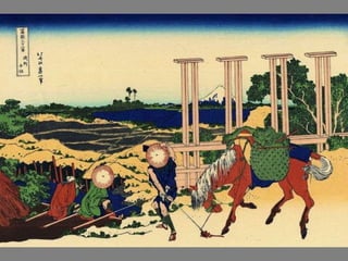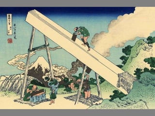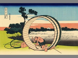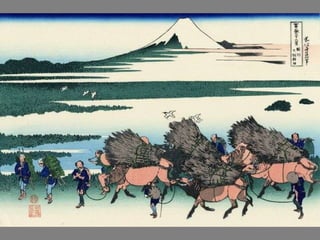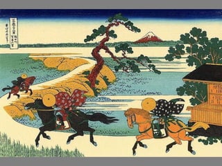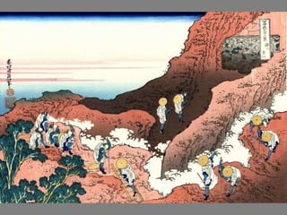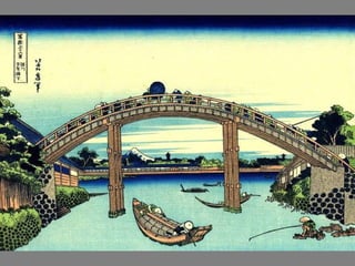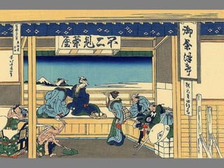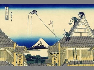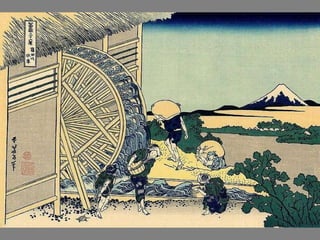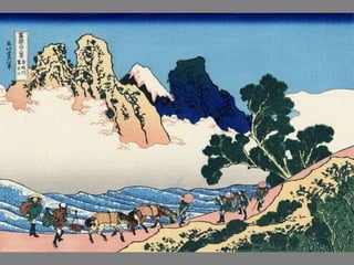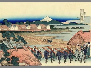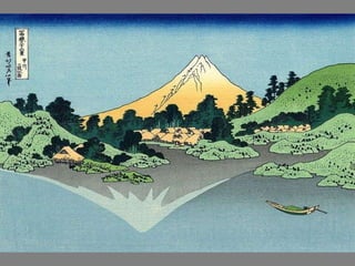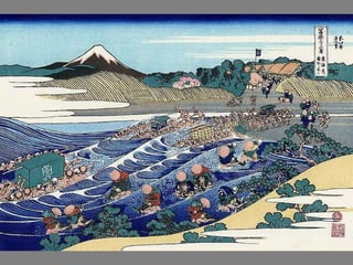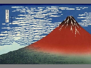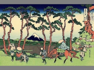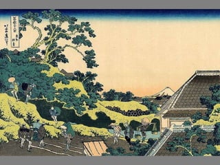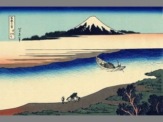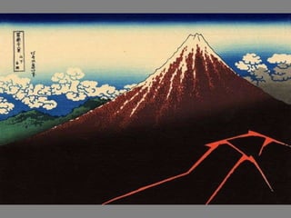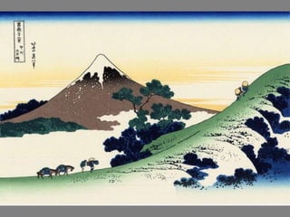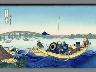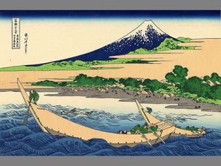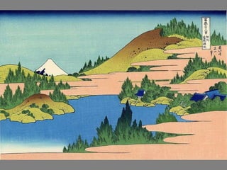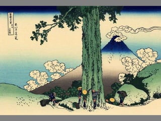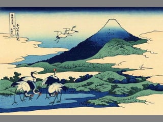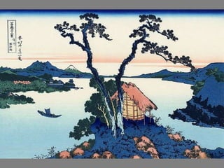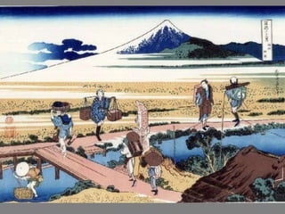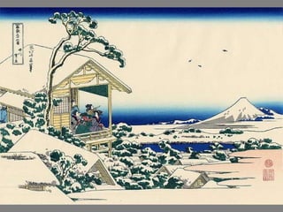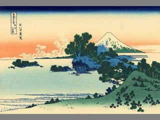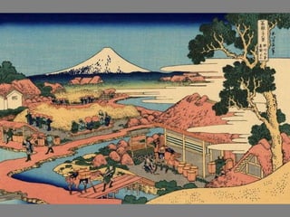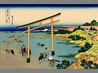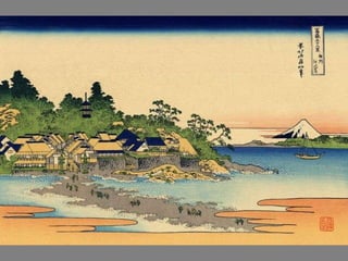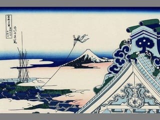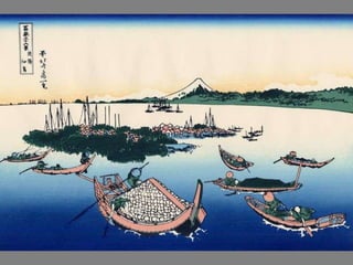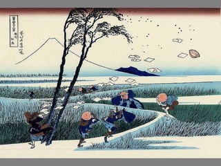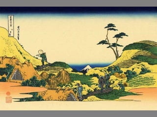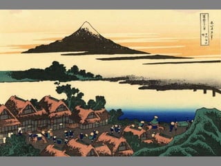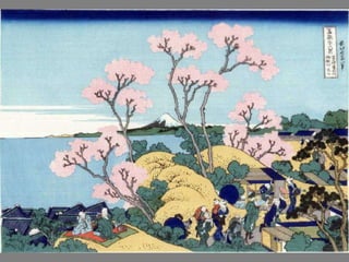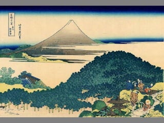 El documento presenta información sobre el artista japonés Katsushika Hokusai, incluyendo el título de una de sus obras más famosas "36 Vistas de Monte Fuji" y su autorretrato realizado en 1839. También menciona una pieza musical japonesa interpretada por el Yamato Ensemble.