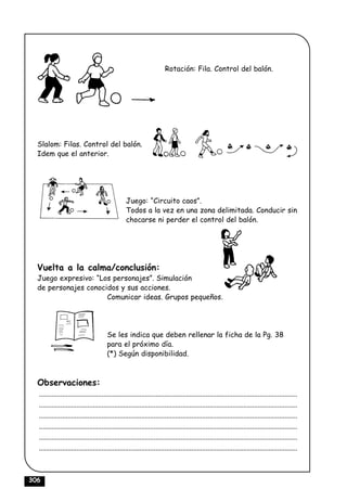 Este documento contiene las instrucciones para cuatro sesiones de educación física para estudiantes de 6to grado. Cada sesión incluye ejercicios de calentamiento, desarrollo de habilidades motrices como el control del balón y pases, juegos, y actividades expresivas para comunicarse a través del movimiento. El enfoque es mejorar la expresividad y el diálogo entre los estudiantes usando el movimiento y la actividad física.