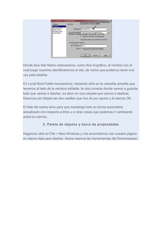 Este documento proporciona un paso a paso básico para usar el programa Dreamweaver. Explica cómo definir un sitio, usar las herramientas como la paleta de objetos y barra de propiedades, y crear la primera página web agregando texto, imágenes y vínculos. También cubre conceptos como tablas, capas, puntos de fijación y cómo previsualizar páginas en el navegador.