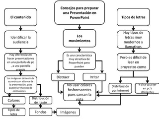 Este documento ofrece consejos para preparar una presentación en PowerPoint, incluyendo identificar la audiencia, usar tipos de letras legibles, colores suaves, imágenes apropiadas y una distribución clara del texto. Recomienda evitar letras llamativas que puedan distraer u irritar, y considerar el tamaño de la pantalla al elegir tipos de letra y fondos.