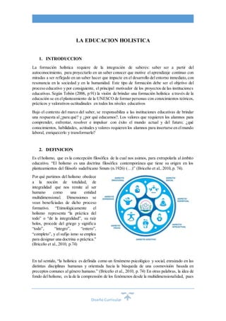 El documento presenta los conceptos clave de la educación holística, la cual busca formar personas de manera integral a través del desarrollo del autoconocimiento, los saberes y las habilidades prácticas con impacto social. La educación holística considera al ser humano como un todo multidimensional y enfatiza el desarrollo equilibrado de lo cognitivo con lo emocional y espiritual. Este enfoque educativo enfrenta obstáculos debido a la resistencia de quienes se aferran a modelos educativos tradicionales fragment