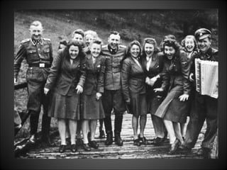 El documento proporciona información sobre el Holocausto, la persecución sistemática y aniquilación de los judíos europeos por parte de la Alemania nazi entre 1933 y 1945. Describe las diferentes etapas de la persecución, incluyendo la creación de guetos y campos de exterminio donde millones de judíos, gitanos y otros grupos fueron asesinados, principalmente a través de cámaras de gas. También incluye fotografías que ilustran las terribles condiciones y actos de crueldad que sufrieron las ví
