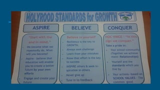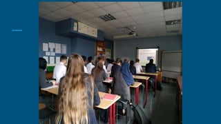 El documento describe las instalaciones y actividades de la escuela secundaria Holyrood en Glasgow. Incluye detalles sobre el comedor, la cafetería, la biblioteca, el gimnasio, el taller de madera, la clase de música, la decoración de los pasillos y la exhibición del trabajo de los estudiantes. También menciona clases como Física, Economía Doméstica, Matemáticas y la utilización de tecnología como ordenadores, programas 3D y gamificación en el aula. Los estudiantes participan en proyectos de