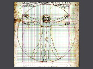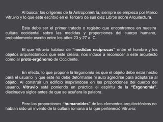 El documento describe el trabajo de Marco Vitruvio sobre las proporciones del cuerpo humano en su libro De Architectura. Vitruvio fue el primero en Occidente en estudiar y registrar las medidas y proporciones del cuerpo humano, influyendo en el desarrollo posterior de la ergonomía. Leonardo da Vinci ilustró las ideas de Vitruvio sobre las proporciones humanas en su famoso dibujo Hombre de Vitruvio.