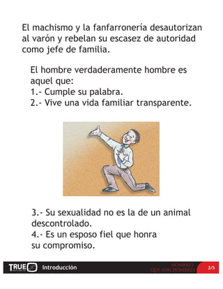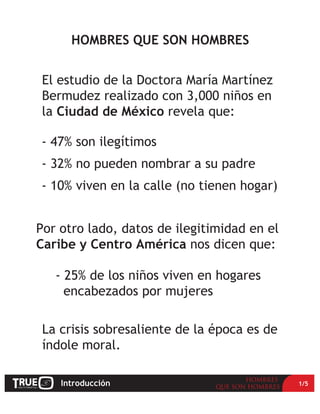 El documento describe los resultados de un estudio sobre niños en la Ciudad de México, que revela altos índices de ilegitimidad y falta de figura paterna. También presenta datos sobre ilegitimidad en el Caribe y Centroamérica. Argumenta que la crisis actual es moral y se debe a la ausencia de autoridad paternal causada por el machismo y la fanfarronería. Propone que para transformar la cultura, los hombres deben asumir sus roles como esposos, padres y líderes siguiendo los principios cristianos.