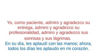 El documento expresa un profundo agradecimiento y admiración hacia los profesionales de la salud que han trabajado arduamente durante la pandemia del COVID-19. Se valora su sacrificio, profesionalismo y empatía hacia los pacientes, destacando la importancia de su labor en la vida de las personas. El autor concluye rindiendo homenaje a estos 'héroes' con una simbólica corona de laurel.
