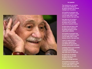 TE QUIERO Tusmanos son mi caricia mis acordes cotidianos te quiero porque tus manos trabajan por la justicia si te quiero es porque sos mi amor mi cómplice y todo y en la calle codo a codo somos mucho más que dos tus ojos son mi conjuro contra la mala jornada te quiero por tu mirada que mira y siembra futuro tu boca que es tuya y mía tu boca no se equivoca te quiero porque tu boca sabe gritar rebeldía si te quiero es porque sos mi amor mi cómplice y todo y en la calle codo a codo somos mucho más que dos y por tu rostro sincero y tu paso vagabundo y tu llanto por el mundo porque sos pueblo te quiero y porque amor no es aureola ni cándida moraleja y porque somos pareja que sabe que no está sola te quiero en mi paraíso es decir que en mi país la gente viva feliz aunque no tenga permiso si te quiero es porque sos mi amor mi cómplice y todo y en la calle codo a codo somos mucho más que dos.