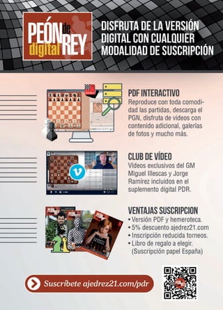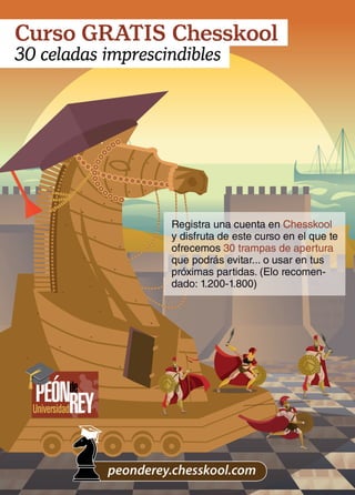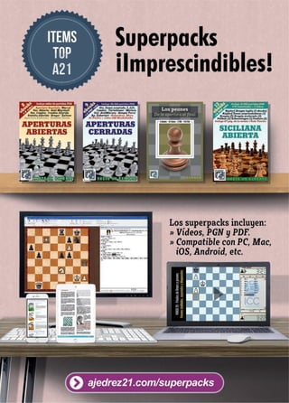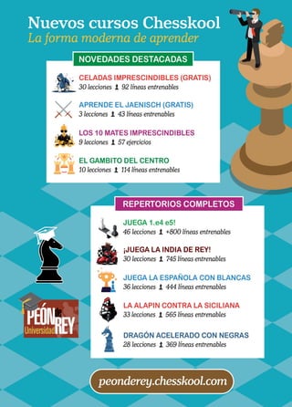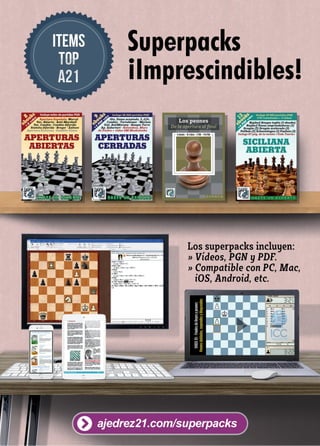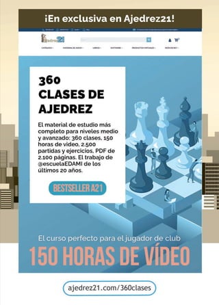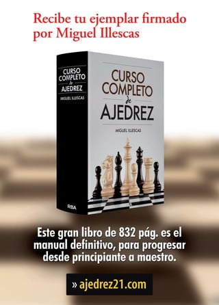Este documento describe el "Curso Completo de Miguel Illescas", un curso de ajedrez que está disponible en tres formatos: libro, PDF y video. El curso cubre temas desde principiante hasta maestro a través de 40 lecciones estructuradas en cuatro bloques. Los comentarios de los estudiantes elogian la calidad y estructura del curso, señalando que les ha ayudado a mejorar su comprensión y juego del ajedrez.