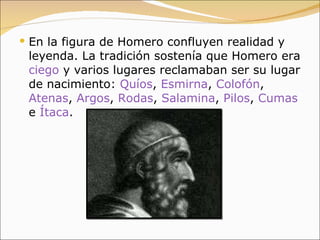 El documento resume la figura de Homero, poeta épico griego al que se atribuyen las obras La Ilíada y La Odisea. Se cuestiona si fue una sola persona o varios autores. También resume la estructura y argumento de La Odisea, que narra el regreso del héroe Odiseo a Ítaca tras la guerra de Troya utilizando su astucia e inteligencia.