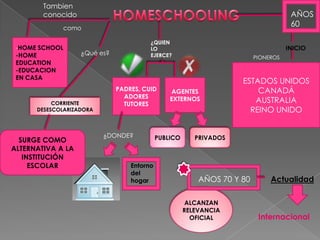 La educación en casa, también conocida como homeschooling, surgió en los años 60 como alternativa a la educación institucional. Los padres, tutores u otros agentes externos ejercen la educación en casa en el entorno del hogar. Actualmente se autoriza en diferentes países bajo distintos niveles de supervisión.