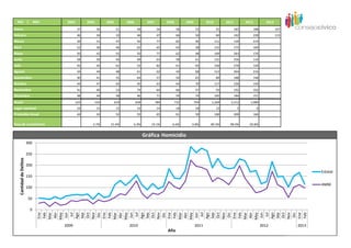 Este documento presenta datos sobre homicidios en México de 2003 a 2013. Muestra que en febrero de 2013 hubo 115 homicidios, una tasa de 2.47 homicidios por cada 100,000 habitantes. La tasa de homicidios en México ha aumentado constantemente desde 2003, cuando fue de 1.14 por cada 100,000 habitantes, hasta 2011 con una tasa máxima de 4.5. Aunque la tasa ha disminuido ligeramente desde entonces, México sigue teniendo altos niveles de homicidios en comparación con otros países.