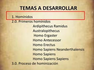 El documento describe la evolución de los homínidos, incluyendo a Ardipithecus Ramidus, varias especies de Australopithecus, Homo Ergaster, Homo antecessor, Homo erectus, Homo neanderthalensis, Homo sapiens y Homo sapiens sapiens. Explica las características físicas y comportamientos de estas especies y cómo representan diferentes etapas en la evolución humana hacia la forma moderna.