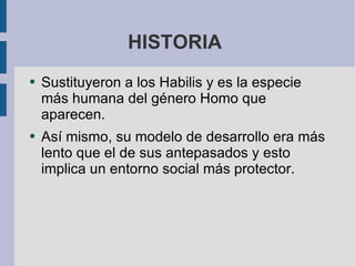 El Homo ergaster sustituyó al Homo habilis y fue la especie más humana del género Homo que apareció, con un desarrollo más lento que implicaba un entorno social más protector. Tenía una capacidad craneal entre 800 y 950 cc, siendo bípedo y con un peso cerebral promedio de 805 gr. Inventó una nueva técnica de talla de piedra conocida como Achelense y fue más cazador que carroñero.