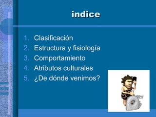 Este documento clasifica al Homo Sapiens en el reino animal, filo de los cordados, subfilo de los vertebrados, clase de los mamíferos y orden de los primates. Explica las adaptaciones fisiológicas del Homo Sapiens como la bipedación y la liberación de las manos, así como su comportamiento flexible y aprendizaje. También describe los atributos culturales del Homo Sapiens como el desarrollo de la cultura, el lenguaje y la organización social, y explica que los primeros humanos procedían de África