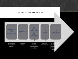 Este documento discute el impacto de la tecnología de la comunicación, especialmente la televisión y Internet, en la sociedad y la cognición humana. Argumenta que mientras la televisión ha llevado a una "sociedad teledirigida" dominada por imágenes en lugar de palabras, Internet está reemplazando cada vez más a la televisión como el principal medio y ha creado un "ciberespacio" multimedia. Sin embargo, también reconoce que los avances tecnológicos tienen efectos tanto positivos como negativos.