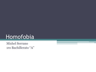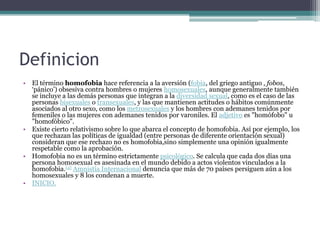 El documento define la homofobia y discute su conceptualización. También examina las actitudes hacia la homosexualidad en diferentes culturas y religiones, señalando que en muchas regiones se persigue o discrimina a las personas LGBT. Además, describe cómo en algunos países la homosexualidad sigue siendo ilegal e incluso se castiga con la pena de muerte.
