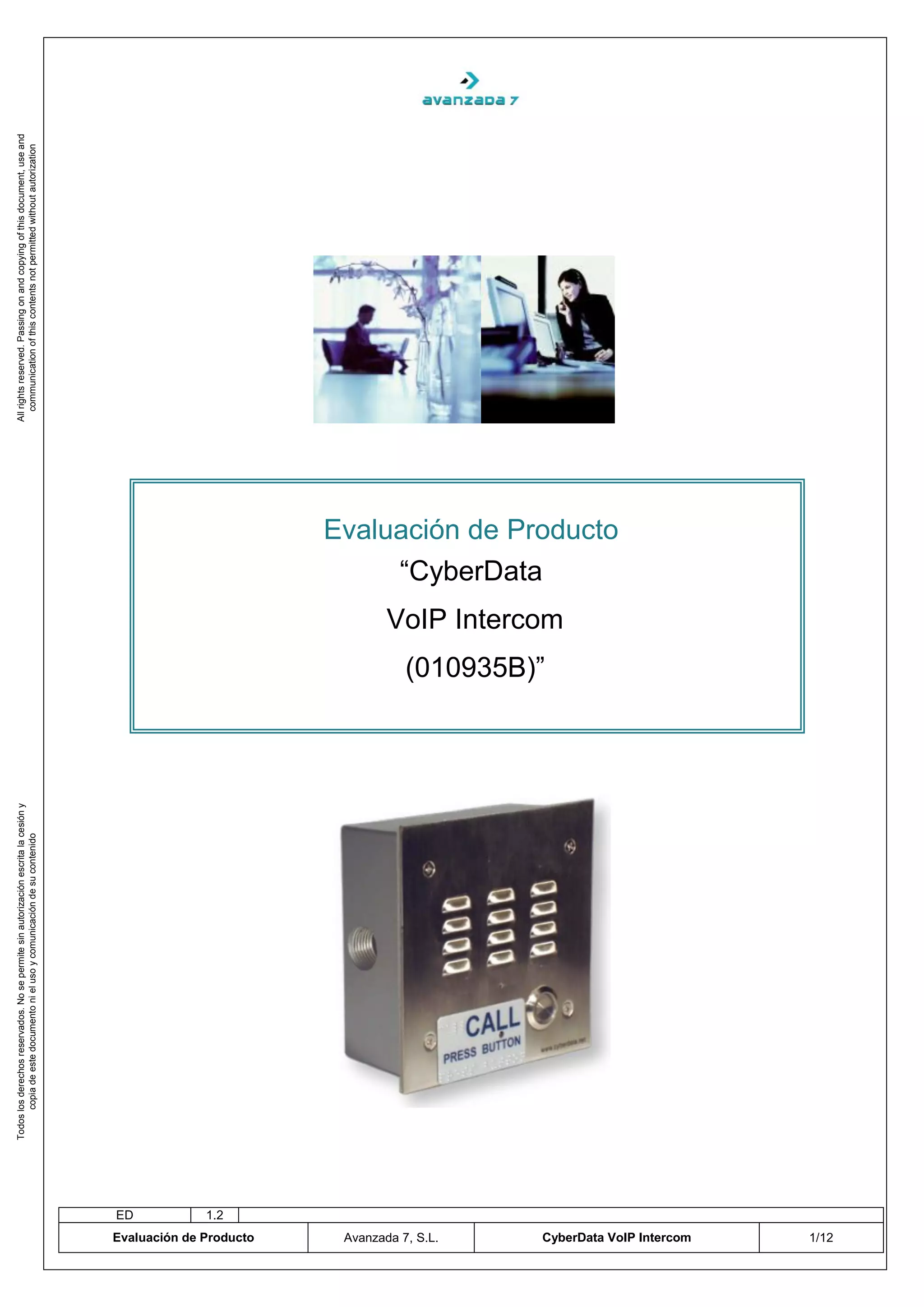Este documento evalúa el producto VoIP Intercom de CyberData, un interfono que funciona a través de Power-over-Ethernet y VoIP. Se puede conectar fácilmente a una red local a través de un solo cable y es compatible con SIP, por lo que se puede conectar a servidores IP-PBX compatibles con SIP. El documento describe la instalación, configuración y operación del dispositivo, y concluye que es una buena opción para instalaciones que requieran interfonos IP con capacidades avanzadas de comunicación y detección de sensores.