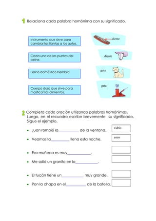 El documento presenta ejemplos de palabras homónimas, que son aquellas que se pronuncian o se escriben igual pero tienen significados diferentes. Explica las clases de homónimas homófonas y homógrafas, y provee ejemplos para practicar la identificación y uso correcto de palabras homónimas.
