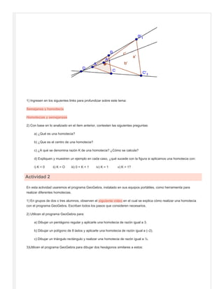 Este documento presenta una secuencia didáctica sobre homotecias para estudiantes de secundaria. Propone actividades para que los estudiantes reconozcan homotecias de razones positivas y negativas usando el programa GeoGebra. Las actividades incluyen aplicar homotecias a figuras regulares e irregulares para analizar cómo varían las medidas, y usar homotecias para generar figuras semejantes. El documento también sugiere enlaces adicionales sobre el tema y una investigación sobre usos de las homotecias en astronomía,