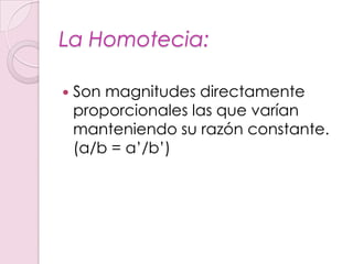 La homotecia es una transformación geométrica que mantiene las proporciones entre las distancias de los puntos de una figura respecto a un punto fijo llamado centro de homotecia. Bajo una homotecia, cada punto es mapeado a otro punto cuya distancia al centro es k veces la distancia original, donde k es la razón de homotecia. Las figuras resultantes después de una homotecia mantienen propiedades como ángulos iguales, segmentos y rectas paralelas y proporcionales.