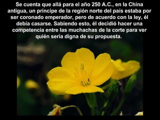El príncipe de una región de China antigua anunció un desafío para elegir su esposa entre las muchachas de la corte: daría a cada una una semilla para que cultive la flor más bella en seis meses. La única hija de una anciana sirvienta del palacio recibió una semilla estéril pero la cuidó con paciencia y amor. A los seis meses fue la única sin flor pero honesta sobre su esfuerzo. El príncipe la eligió por cultivar la flor de la honestidad.
