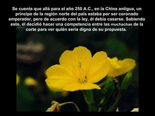 Un príncipe chino anunció que se casaría con la mujer que cultivara la flor más bella de las semillas que les daría a las pretendientes. Aunque una joven pobre no tenía habilidad para la jardinería, cuidó su semilla con paciencia y amor aunque nada brotara. Cuando las demás mostraron hermosas flores, ella fue honesta sobre su fracaso. El príncipe reveló que las semillas eran estériles y la eligió a ella por su honestidad.