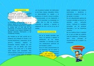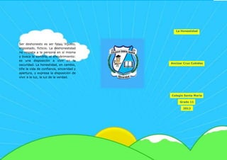 El documento define la honestidad como comportarse y expresarse con sinceridad y coherencia, respetando los valores de la justicia y la verdad. Ser honesto requiere ir más allá de los propios deseos e intereses y apegarse a la verdad objetiva. La honestidad siembra confianza al vivir abiertamente bajo la luz de la verdad, mientras que la deshonestidad busca la oscuridad y el engaño.