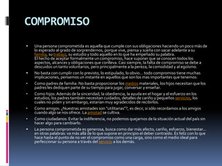 Los documentos describen las cualidades de la honestidad, el compromiso y la humildad. La honestidad implica congruencia entre pensamientos y acciones, y es indispensable para relaciones de confianza. El compromiso significa cumplir con las obligaciones y hacer más de lo esperado. La humildad se refiere a no alardear y valorar a los demás por lo que son.