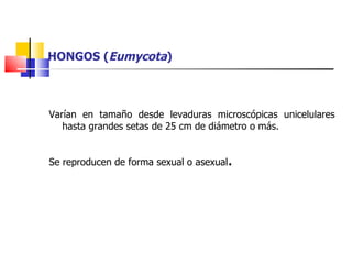 Los hongos son organismos eucariotas heterótrofos que se reproducen de forma sexual y asexual. Varían en tamaño y estructura, desde levaduras unicelulares hasta setas grandes. Se clasifican en cuatro divisiones principales - Zygomycota, Ascomycota, Basidiomycota y Deuteromycota - basadas en sus características reproductivas. Cumplen un papel importante en la descomposición de materia orgánica y en procesos industriales como la fermentación, pero también causan enfermedades en plantas, animal