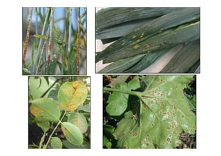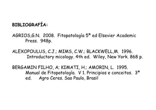 Este documento trata sobre hongos fitopatógenos. Explica la definición de hongos, sus principales grupos taxonómicos, sintomatología y diagnóstico de enfermedades fúngicas. También describe el ciclo de vida de una enfermedad fúngica y formas de manejarlas.